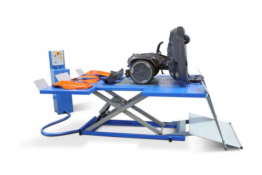 Die elektrohydraulische Hebebühne bietet sogar dem Husqvarna-Flaggschiff „Ceora“ ausreichend Fläche. Selbst eine komplette Zerlegung des Gerätes in individuell anpassbarer Arbeitshöhe ist möglich. Die herausnehmbaren Seitenbleche erleichtern die Arbeit am Gerät.