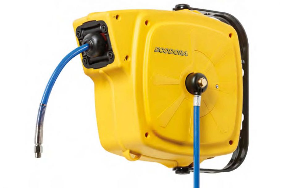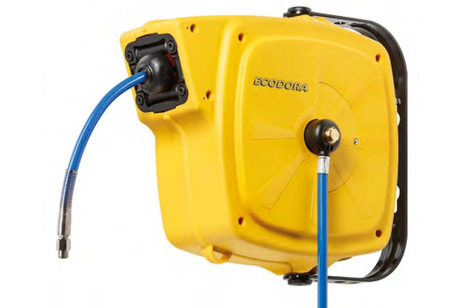Schlauchaufroller für Luft und Wasser 20 bar, Federpaket ausgelegt für 25.000 volle Zyklen, Gehäuse aus stoßfestem ABS, 12 m – 10 x 14,5 (972.112), Eingang und Ausgang 3/8“, mit Drehgelenk am Schlauchausgang. Lieferung mit Zentrifugalbremse. Dazu sind ebenfalls eine Hochdrucklanze mit Knickfunktion sowie eine Bajonett-Halterung als Diebstahlschutz erhältlich (s. Produktblatt).
