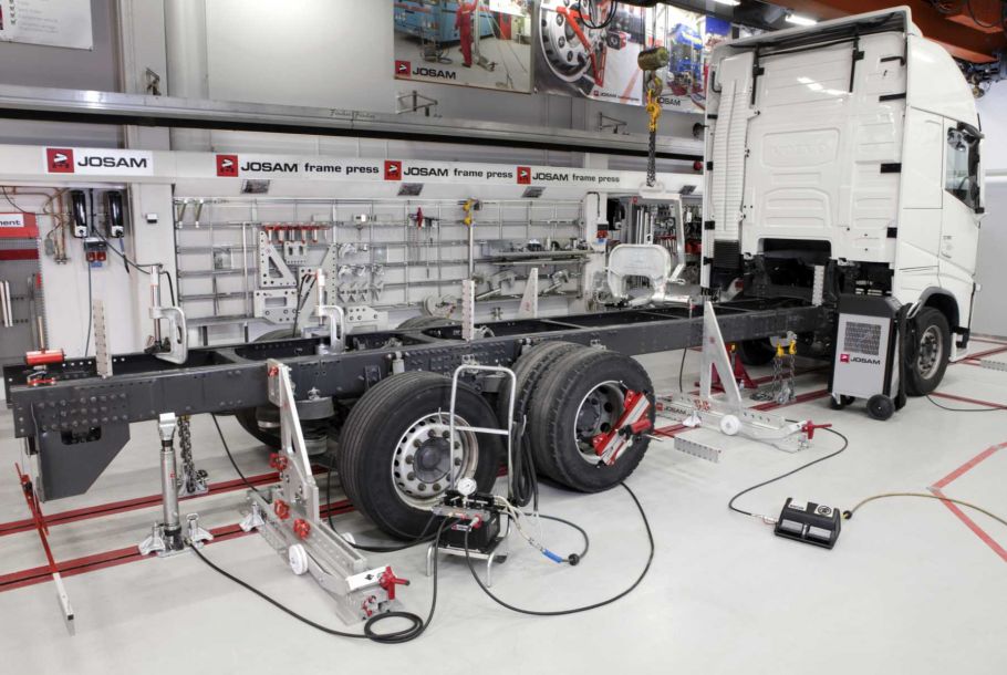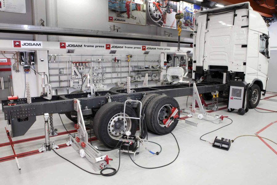 Mit Rahmenrichtanlagen von JOSAM werden deformierte Rahmen und Fahrerhäuser effizient repariert. Dafür sorgt der hohe technische Qualitätsstandard und ein umfassendes Sortiment an Zubehör.
