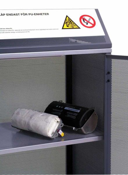 Bis zu 10 Airbags- und Gurtstraffereinheiten sind innerhalb des Schrankes aus 1,25 mm starkem Lochstahl sicher gelagert. Lieferung mit höhenverstellbaren Füßen und einer zusätzlichen Befestigungsvorrichtung für die Wandmontage. Natürlich erfüllt auch das Schrankschloss die deutschen Sicherheitsnormen.