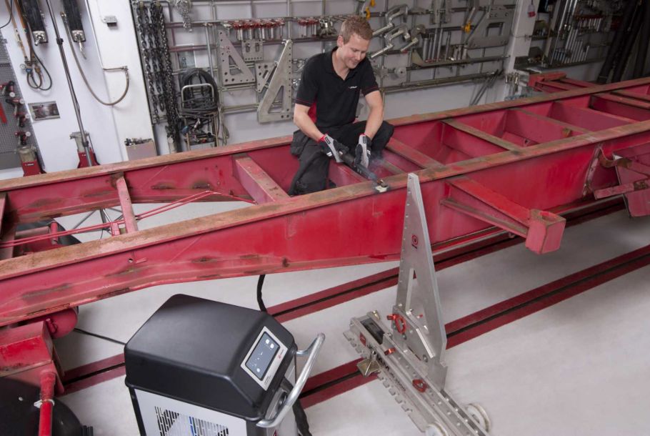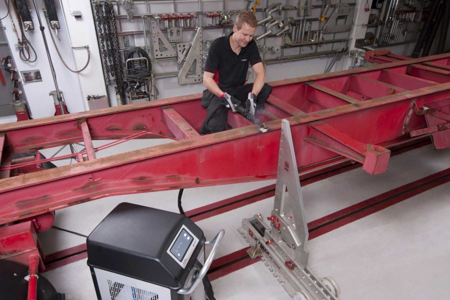 Der robuste und ergonomisch ausgelegte Induktionserhitzer eignet sich für leichte Rahmenrichtarbeiten an Nutzfahrzeugen.