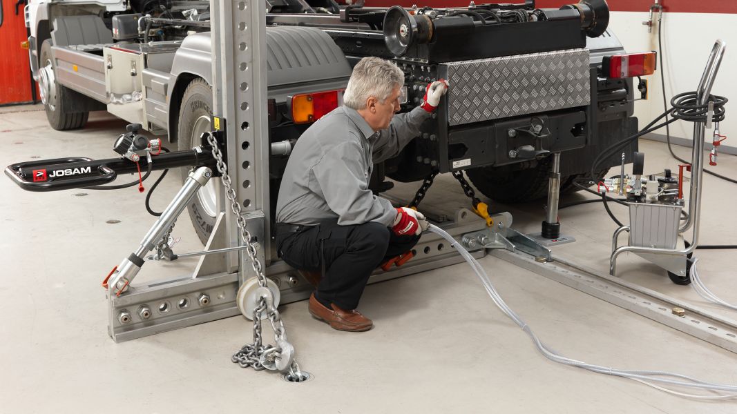 JOSAM i-press ist ein System zum Richten mittelschwerer und schwerer Nutzfahrzeuge. I-Press ermöglicht das Richten ohne Fundamentrahmen. Die zum Patent angemeldete Neuentwicklung zeichnet sich durch Flexibilität und leichte Handhabung aus.