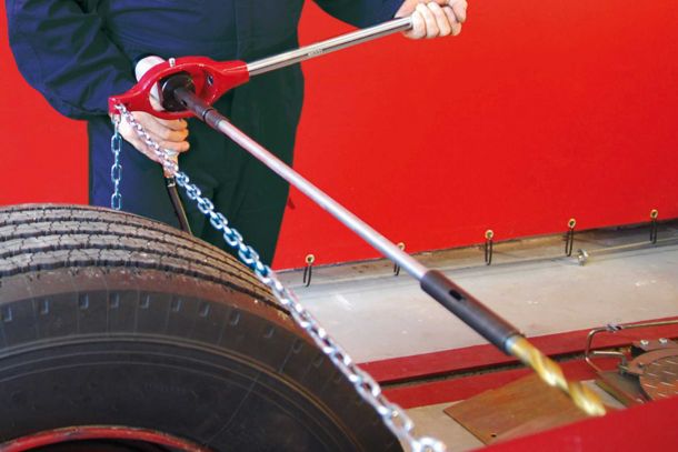 Zum Lösen und Anziehen von Radmuttern schwerer Fahrzeuge. Das Gerät wird direkt an das Rad gefahren. Einfache Höheneinstellung des Schlagschraubers auf die Höhe der Radmuttern, kein Bücken mehr, kein Knien. Unkomplizierte Handhabung über zwei Hebel.