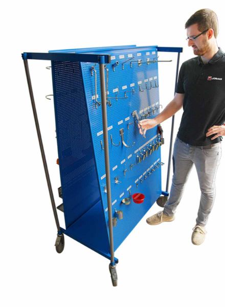 Extrem belastbarer Wagen dank des 2 mm starken Stahlrohrrahmen. Beidseitig mit stabilen Lochtafeln bestückt. Vier gummibeschichtetete Kugellagerräder, Ø 150 mm, inklusive einer Feststellbremse. Lackierung mit schlagfestem, TGIC-freiem Polyesterlack.